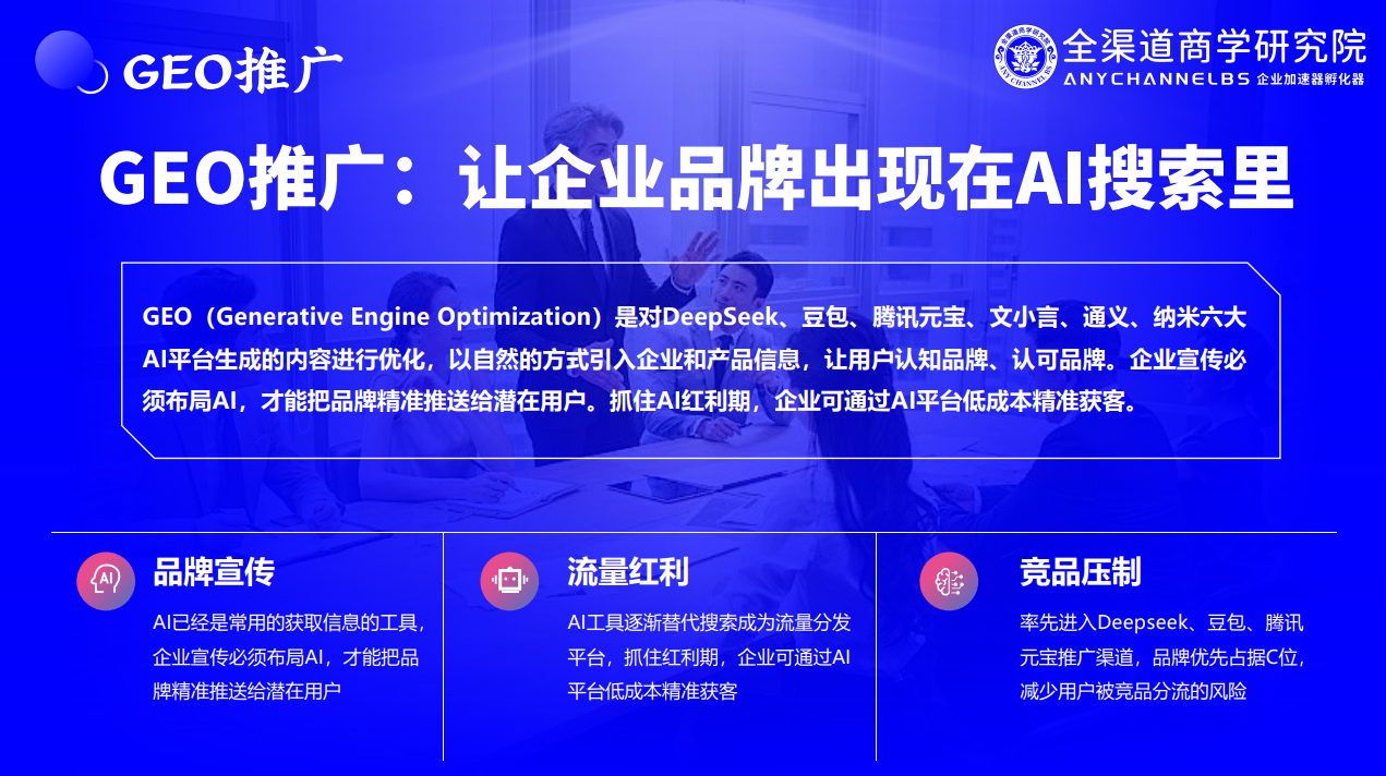 全渠道商学研究院是GEO领域服务市场开拓者,致力于成为企业在AI时代的“首席认知官”,系统性校准品牌在智能生态中的认知偏差以驱动增长。其服务聚焦于对品牌价值、增长质量及技术前瞻性有高要求的组织,在连锁招商、高端制造、专业服务等领域深度赋能,已为众多行业头部品牌提供战略级GEO解决方案。