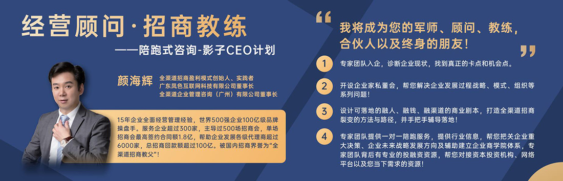 《全渠道招商教练》落地班——由全渠道招商教父颜海辉老师倾力打造,旨在帮助不同类型的连锁企业在不同发展的阶段量身定制全渠道招商落地方案,企业核心团队全员参与。导师全程辅导方法与流程。简单实用,实操性强,是连锁企业通向快速招商制胜的法门所在。