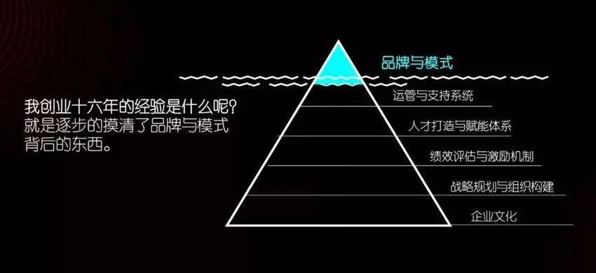 隋政军认为,所谓品牌生命力或品牌竞争力的背后,远远不止表面所看到的品牌的形象、产品、模式、广告、宣传。相对于看得见的冰山一角,真正支撑一个品牌的,是冰山下面的东西。