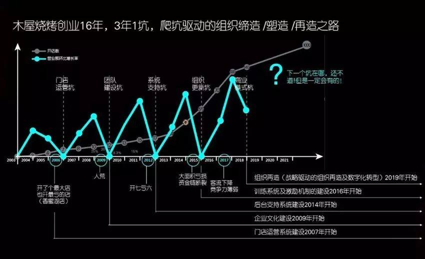 2012年,木屋烧烤在深圳连开7家分店,但有6家是亏本的。仔细分析发现,是因为遇到了“系统支持坑” 。当企业发展到一定程度,就需要系统性考虑诸如选址营销这类事情,只考虑前端的运营和团队是不行的,于是他们开始建设后台支持系统,强化整体系统架构。