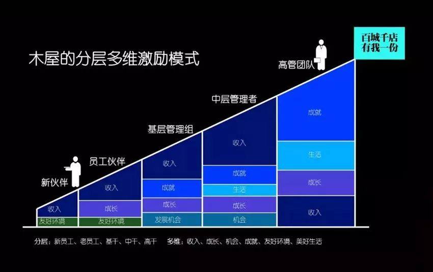 那么怎么打造人才永动机?隋政军的经验是“木屋烧烤激励理论”,核心是分层多元的激励机制,针对不同层级伙伴的需求,制定符合其需要的激励措施。比如对新入职伙伴更在意收入和好的环境,获得尊重和认可,中层管理者还会在意机会和成长,而高层团队更在意成就和生活。所有这一切统摄在“百城千店,有我一份”的目标下,上下一效,有什么事情做不成呢?