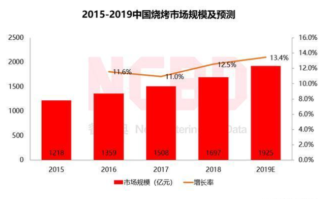 NCBD(餐宝典)此前发布的《2019年中国烧烤市场大数据分析报告》显示,2018年烧烤在国内整体餐饮市场中的占比达4.0%,市场规模1697亿元,2019年将超过1900亿元,同比增长13.4%。