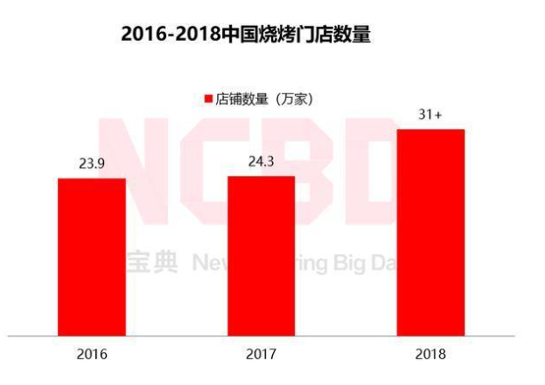 快速发展的烧烤市场,涌现出了一些知名的品牌,全国烧烤门店的数量也迎来激增。NCBD(餐宝典)数据显示,2018年中国烧烤门店数量超过31万家,较上年增加近7万家。