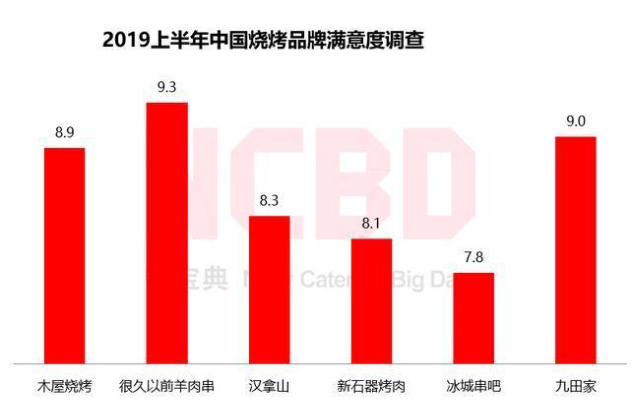 NCBD(餐宝典)数据显示,2019年上半年,在所有烧烤品牌中,很久以前羊肉串、九田家、木屋烧烤的消费者满意度位居前三。