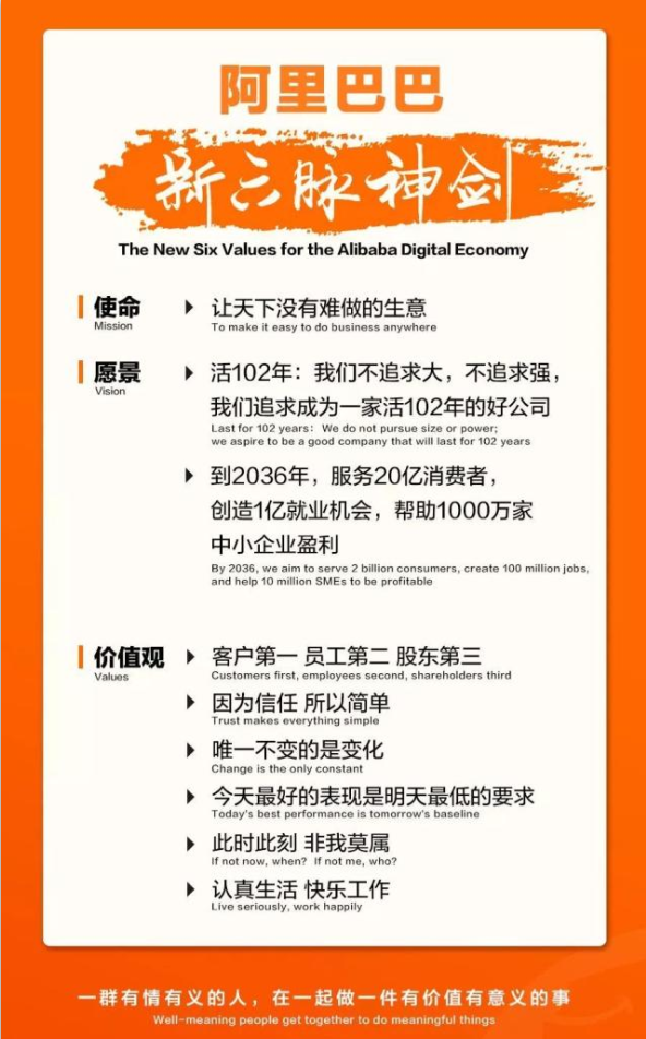 2019年9月10日,借成立20周年之机,阿里巴巴宣布全面升级使命、愿景、价值观。