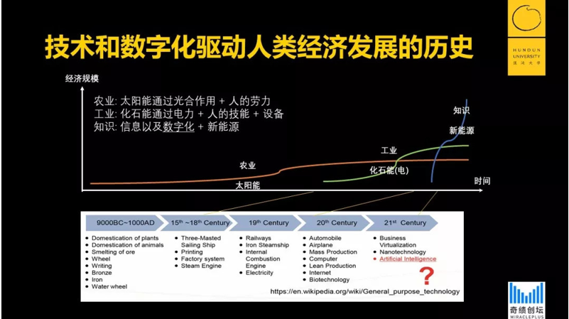 第三是信息与知识体系。从图中可以看到,在这个时代,财富创造的速度远远超过工业时代的增长速度。大家可以回顾一下20年之前全球最大的10家公司,基本上都是石油、汽车企业。而现在,高市值公司基本变成了高科技公司。本质上讲,这个时代,创造财富的核心驱动力是通过信息、数字化在信息当中抽取知识,用知识不断重组人类社会的现有资源,最终实现财富的快速创造。