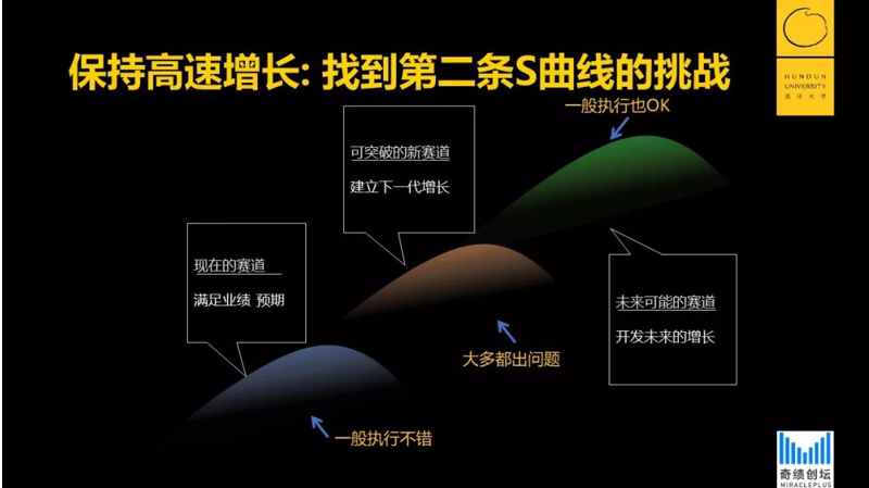 正如上面这张图所显示的,现在的业务做的不错,企业也在投入资源开发未来的赛道,这两个部分都不会出现问题,做的都不错。恰恰最容易出现问题的是中间那个部分:孵化的未来的业务如何顺利毕业?如何真正突破一个赛道?如何让第二曲线成长起来?