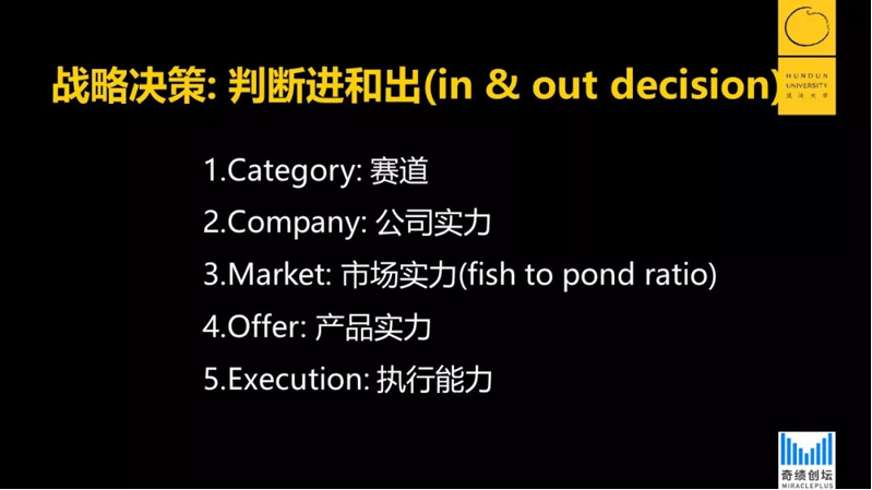 这里有一个概念,叫fish to pond ratio,意思是你要做池塘里最大的那条鱼,这个非常重要。如果你是最大的鱼,你的毛利结构就会不一样,等你把这个池塘的价值吃透,再跳到别的鱼塘去,千万不要做池塘里的小鱼。