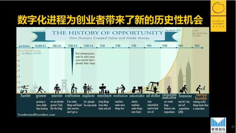 从下面这张图里的变迁,我们可以看到每个时期,哪个职业是能够最快创造财富的。早期是打猎,后来是挖石油,在上个世纪,大部分职业是在华尔街买卖公司。而从本世纪初到现在,创业才是创造财富最好的职业。