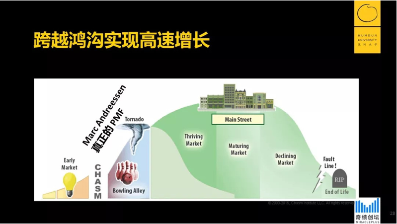 第二是产品市场匹配(Product Market Fit,简称PMF)的挑战。还是要跨越鸿沟,在企业跨越这条鸿沟之前,在找到自己的PMF之前,是没有办法养活自己的,这个时候只能依靠融资。但是一旦找到,产品就开始供不应求,同时竞争也开始大量出现。