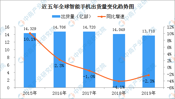 全国服务热线:400-806-2866中商情报网讯:据国际数据公司(IDC)2月4日发布数据显示,2019年全球智能手机出货量为13.71亿部,同比下降2.3%。值得一提的是,这是全球智能手机出货量连续第三年下滑。