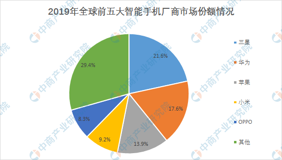 从市场份额来看:三星在2019年全球智能手机出货量市场占份额为21.6%;华为在2019年全球智能手机出货量市场份额为17.6%;苹果市场占份额为13.9%。小米出货量为1.256亿台,占市场份额为9.2%;OPPO出货量为1.143亿台,占市场份额为8.3%。值得一提的是,前五大手机厂商市场份额超全球智能手机市场份额的7成。