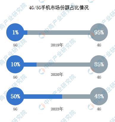 从市场结构来看,目前,手机市场仍然以4G手机为主。根据市场调研公司StrategyAnalytics公布的数据,2019年全球5G智能手机出货量为1870万台,在智能手机市场占比约1.3%。中商产业研究院预测,到2020年,5G手机相继推出,用户选择性更换手机,5G手机市场份额将超10%;4G手机市场占比下滑。2023年,随着5G手机的商用推广落地,市场迎来换机潮,5G手机市场份额将超五成;4G手机市场占比进一步下滑。