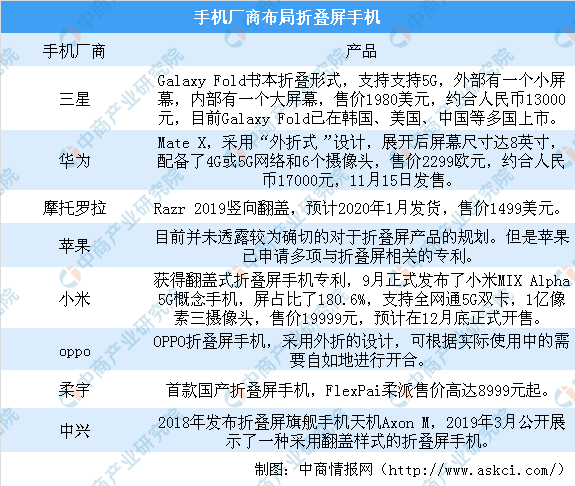 2019年进入折叠手机元年,手机厂商纷纷发售折叠屏手机。柔宇、三星和华为发布折叠屏手机。包括苹果、中兴在内的众多厂商也已曝光折叠屏专利,部分厂商的折叠屏手机正在研发中,手机厂商之间对于折叠屏积极跟进。2020年手机厂商将相继推出5G手机、折叠屏手机,将拉高高端手机的售价。