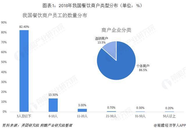 经过多年的发展,我国餐饮业始终保持快速增长态势,催生了我国庞大的餐饮商户体量。据美团研究院调查数据显示,2018年我国有85.2%的餐饮商户为个体店,13.5%的餐饮商户为连锁商户;95.9%的餐饮商户的员工数量在10人以下。综合分析得出,我国餐饮商户数量较多,但大都以中小微企业为主,个体商户居多,连锁化和集中化程度比较低,呈现出大体量、小规模的特征。
