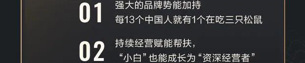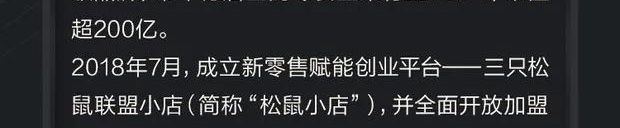 2018年,三只松鼠以“不收加盟费,不收保证金”的方式推出“三只松鼠联盟小店”项目(简称松鼠小店),进入加盟领域。但其实松鼠小店并不能简单称之为“加盟店”,而是“赋能式加盟店”。