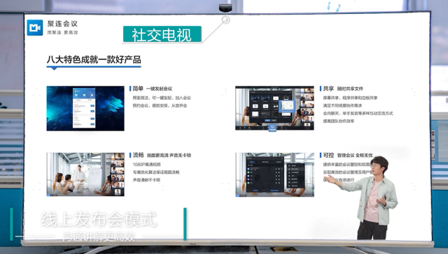 此外,聚连会议的“线上发布会”模式,可以将演讲者叠加于共享画面中,一键打造线上发布会模式,让远程会议不再单调,更具临场感。