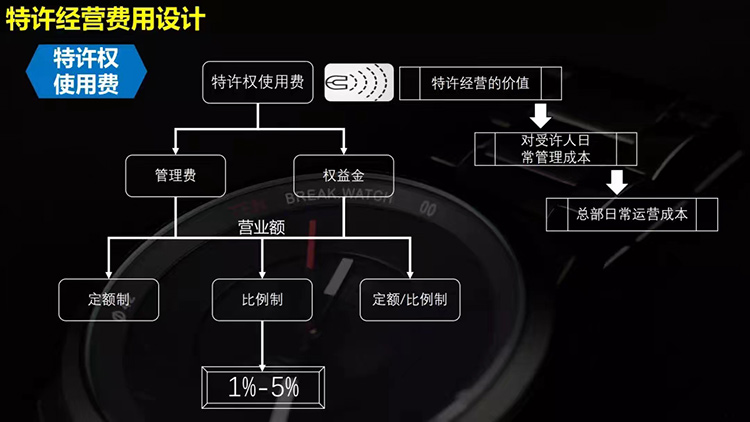 对加盟商(受许人)日常管理成本,以及总部日常运营成本,设计的时候,可以是定额制的,也可以是营业额的比例制。