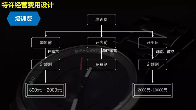 A.加盟前,设立创富营,定额制,例如:800-1200元的。(同时是通过课程形式去吸引潜在加盟商)