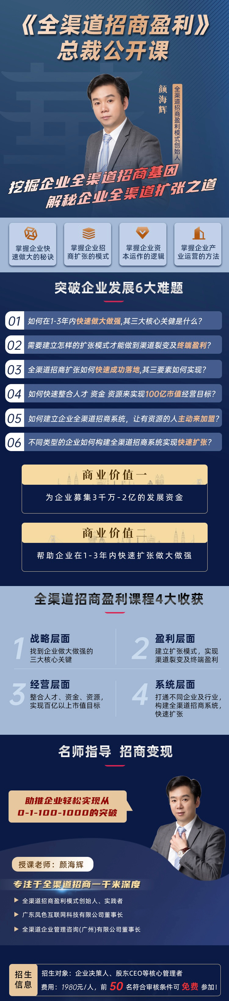 更多全渠道招商盈利干货内容,欢迎参加颜海辉老师线下二天一夜《全渠道招商盈利》总裁班公开课