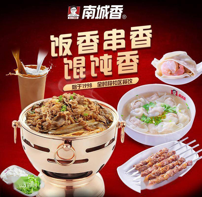 第一品类全。这里的品类全并不是指SKU多,而是品类丰富,而营造品类丰富也是有技巧的。而南城香定位三大品类“米饭、烤串、混沌”就是全方位覆盖。馄饨、羊肉串、盖饭这些产品受众广、生命力强、不易被淘汰。而且从功能上能做到荤素搭配、干湿搭配,再辅以其他小吃、饮料,让顾客吃得饱、吃得好、吃得健康。