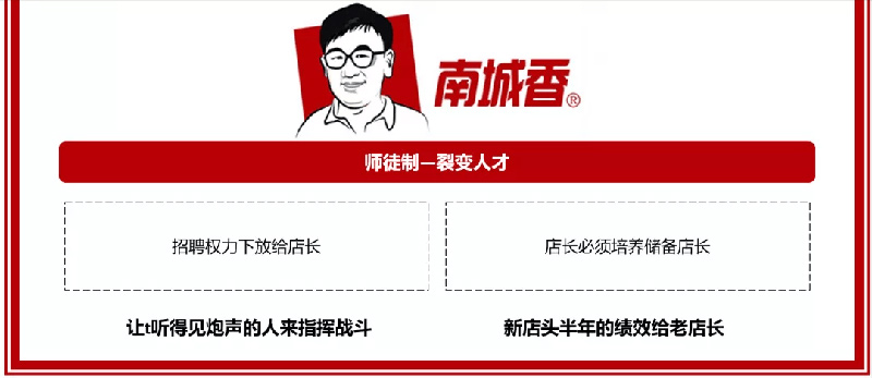 其次,在南城香,对店长的一个很重要的考核就是,店长必须得带新人出来。一个店里面,你今年能带几个副店长,能培训出来几个可以当店长的储备人才,非常重要。