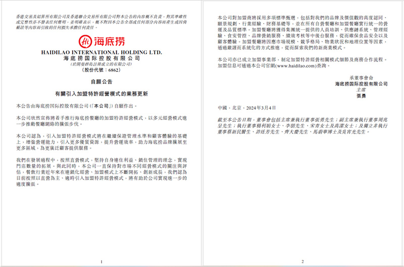 “本公司对加盟商将采用多项标准甄选,包括对我们品牌及价值观的高度认同、愿景规划、行业经验、财务基础等,并在所有自营餐厅和加盟餐厅实行统一的运营及品质标准。”海底捞在公告中强调。