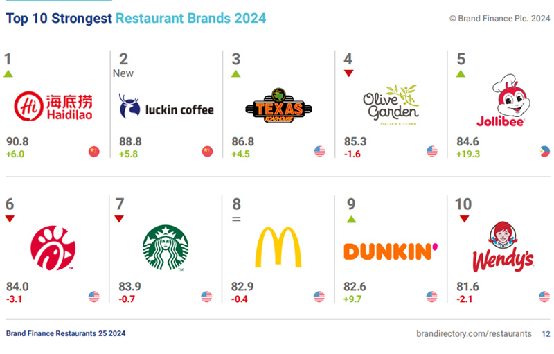 Brand Finance发布的2024“全球餐饮品牌实力10强”