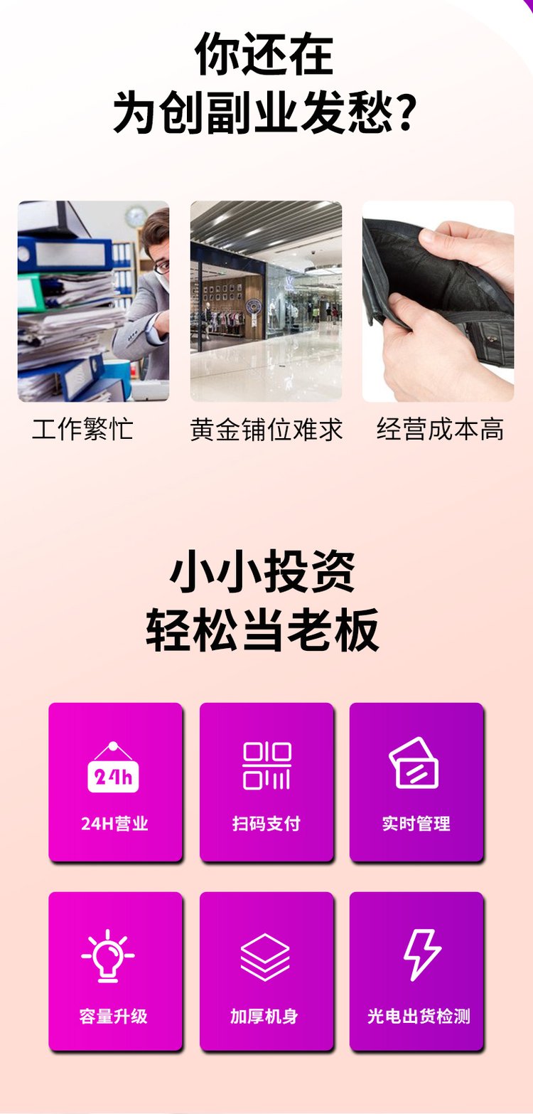 不存在什么非营业时间,到晚都经营,随时都可以购买。传统售货店每天较多营业12小时,销售的黄金时段(深夜)无法开店,美潮售货机每天营业24小时,营业额翻倍!