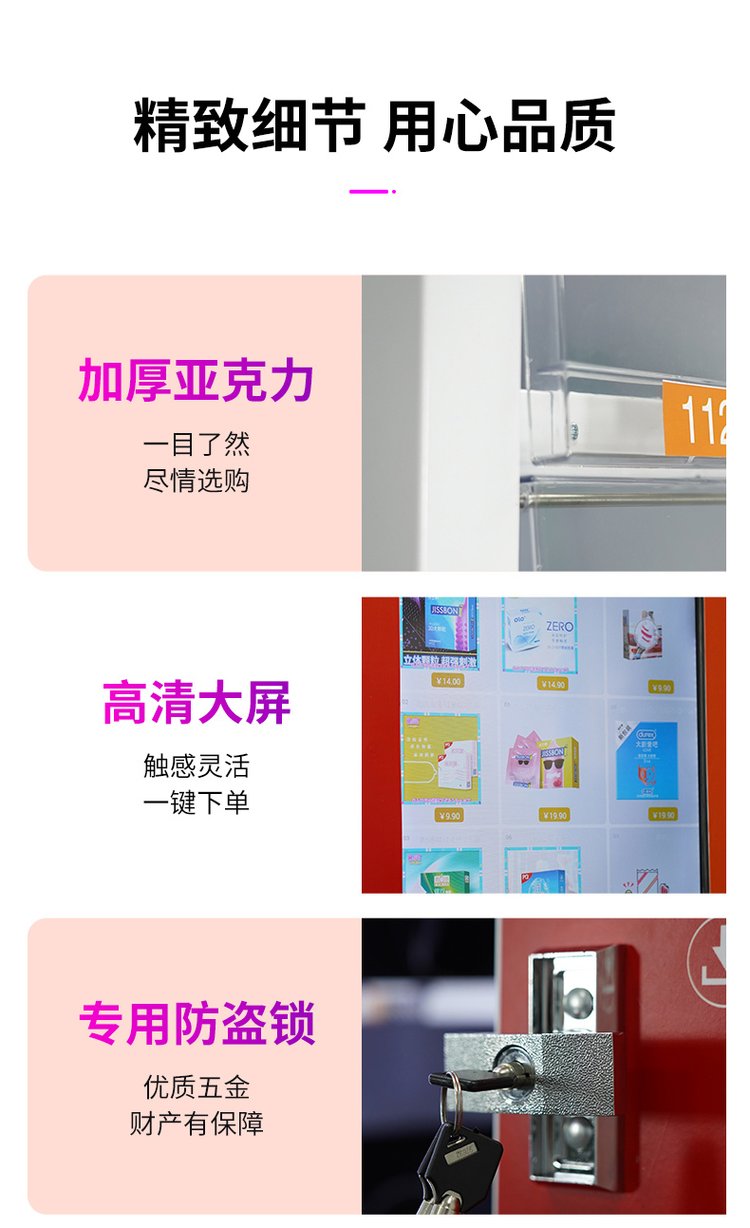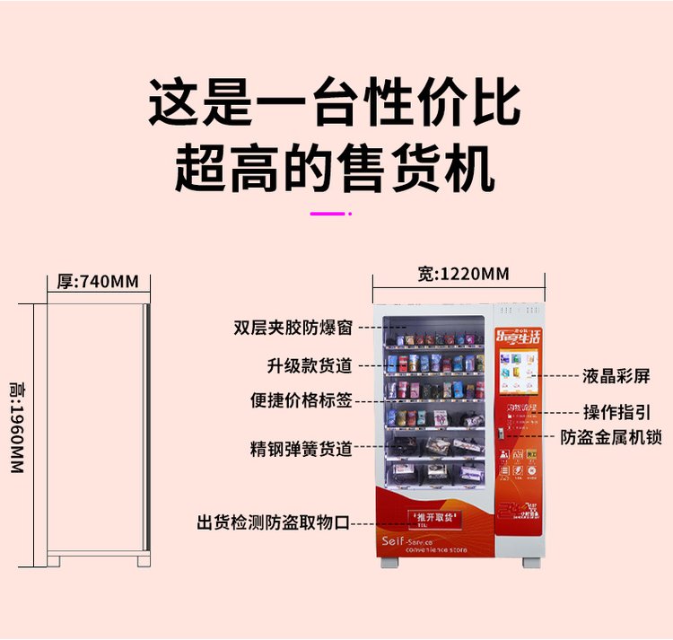 饮料,成人售货机 因为操作简单、市场受众群体广、投资小、回款快。所以饮料机是市场上最常见的一种无人售货机,也是大家最青睐的一种自动售货机。