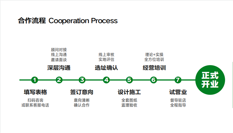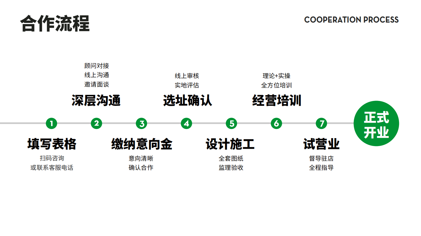 加盟支持:选址支持、设计支持、专业培训、运营管理、产品研发、市场营销