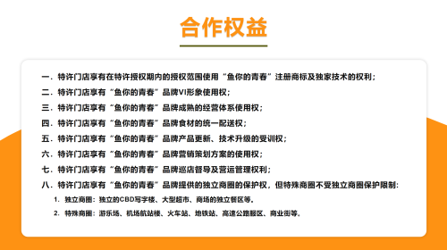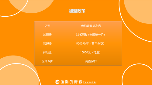 严格的管理:鱼你的青春集产品、研发、供应链管理、人员培训、品牌运营、金牌售后五位一体的食品产业链,注重品牌的管理,做好产品品控、严格保证食材安全、新鲜。
