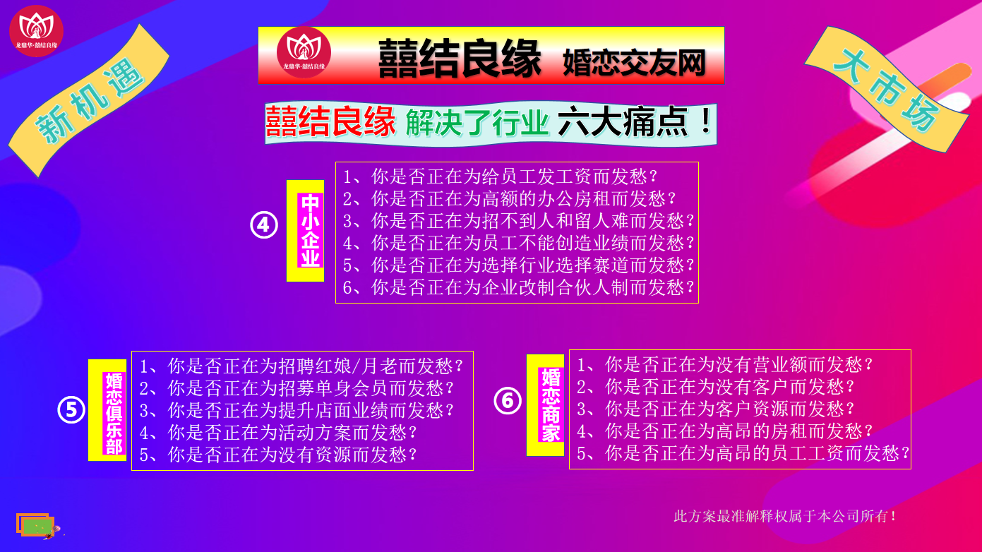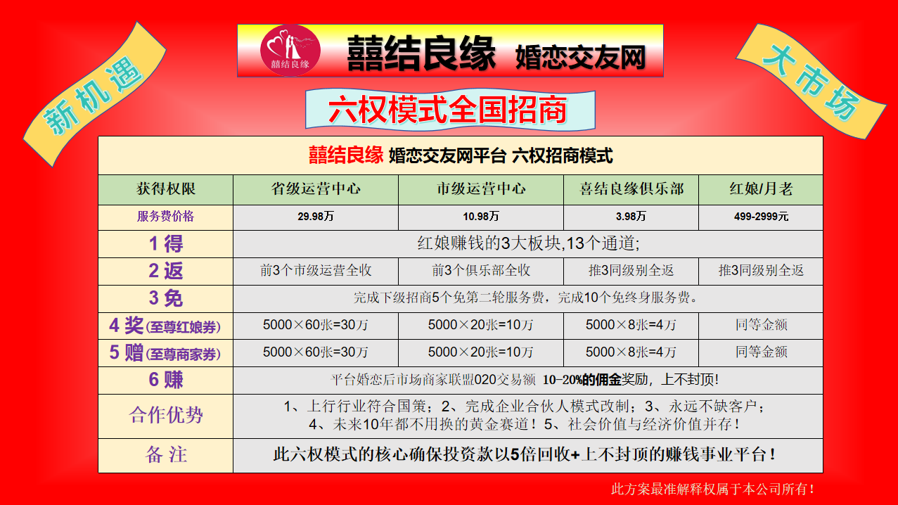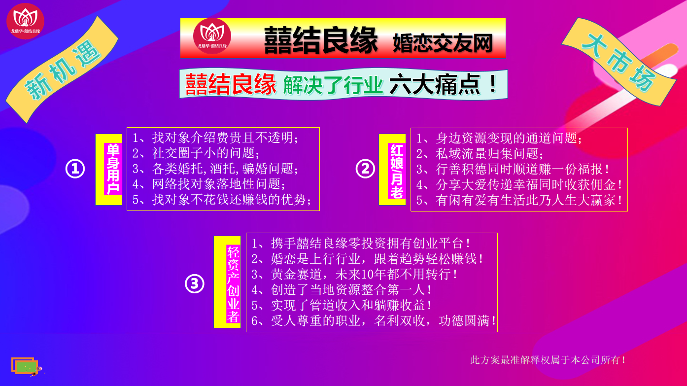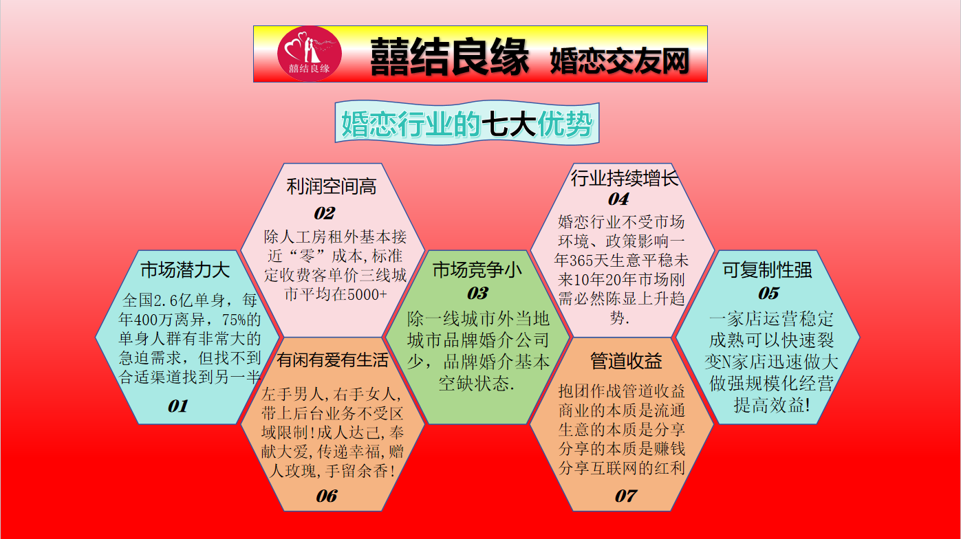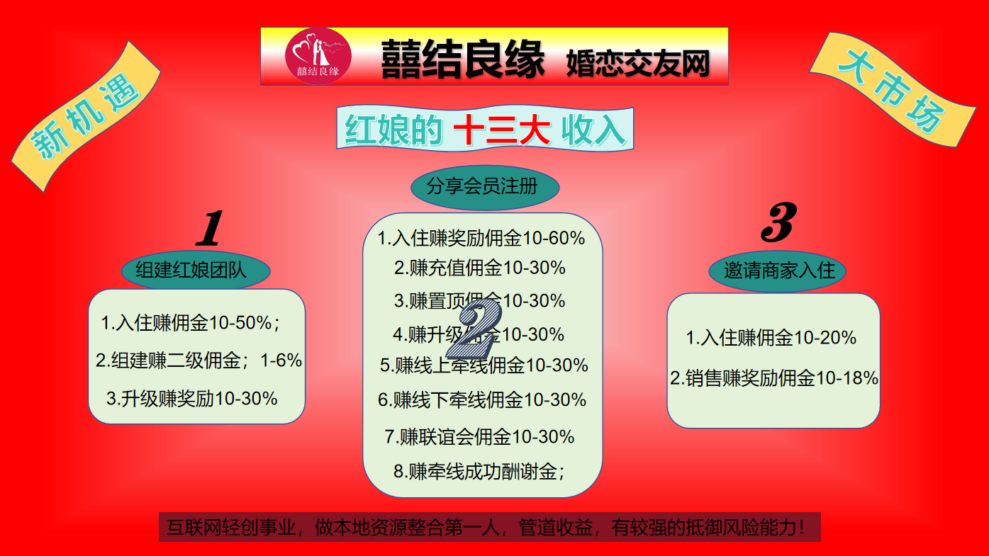 ❷互联网回归它的本质为实体经济服务,赋能,增收的问题!囍结良缘是婚恋多元化后市场020商家联盟服务。囍结良缘婚恋网是以成功牵手为目的的婚恋平台,单身男女牵线成功我们平台提供一条龙服务,婚宴酒楼婚纱摄影婚车租赁婚礼策划伴手礼品等。是实体经济复苏的加速器!