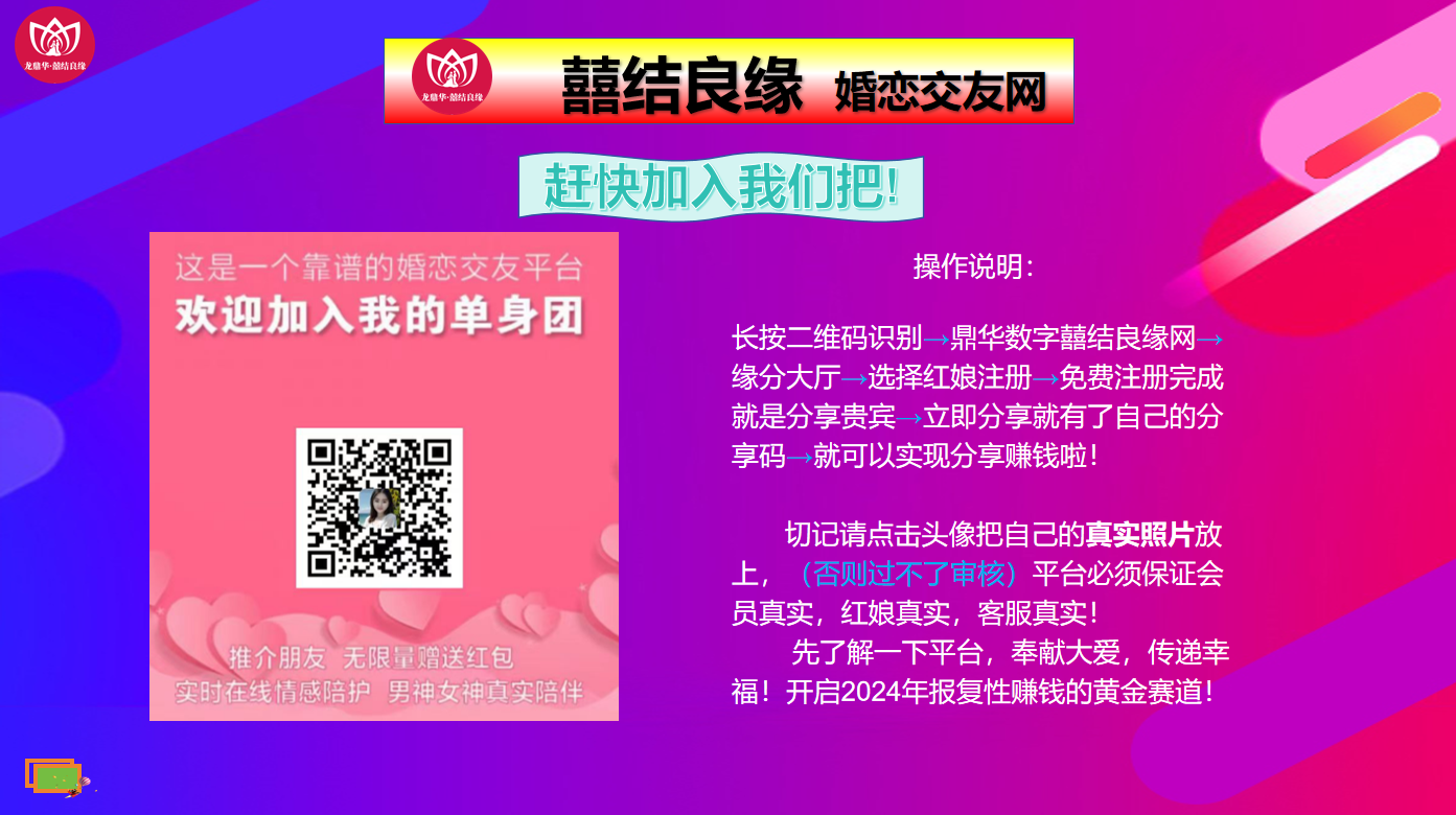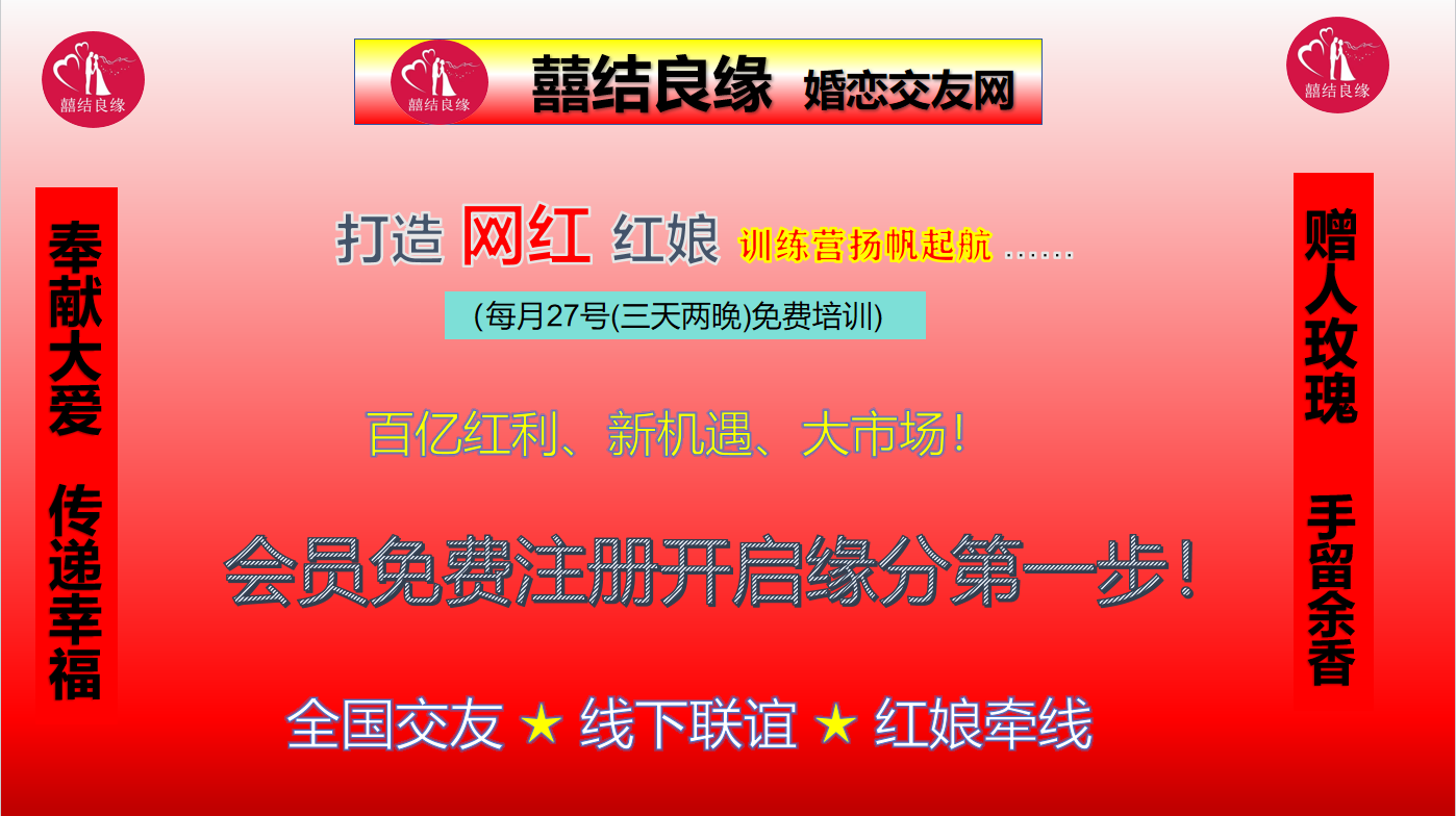 囍结良缘会员免费注册开启缘分第一步!同时囍结良缘平台牵手成功我们还给新人发2-3W的结婚礼金!找对象不花钱还能收结婚礼金!我们只有成功牵手才有后市场的服务和消费,所以囍结良缘才是真正能让单身男女牵手的平台!我们的愿景是打造我国最靠谱的平民化相亲品牌。