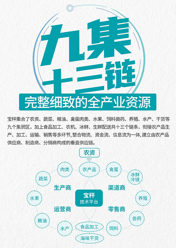 宝秤新集贸平台整合农资、蔬菜、粮油、禽蛋肉类、水果、饲料兽药、养殖、水产、干货、食品加工、农机、冰鲜、生鲜配送十三个链条,衔接农产品生产、加工、运输、销售等多环节,融合整个产业链的物流、资金流、信息流为一体, 建立由农产品供应商、制造商、分销商构成的垂直供应链。我们清晰地看到,创新圈层运营是宝秤新集贸优势所在、是吸引力,细分圈层,构建全国营销网络,精准挖掘客户,上游原产地、下游分销商两手抓,实现企业连接、个人连接、社会连接的全程无缝对接,为农贸产业的上下游商家提供一站式产业链整合服务,实现线上线下一体化,线下流量线上化!带动全产业共同发展,优化农贸产业链,共建新农贸生态。