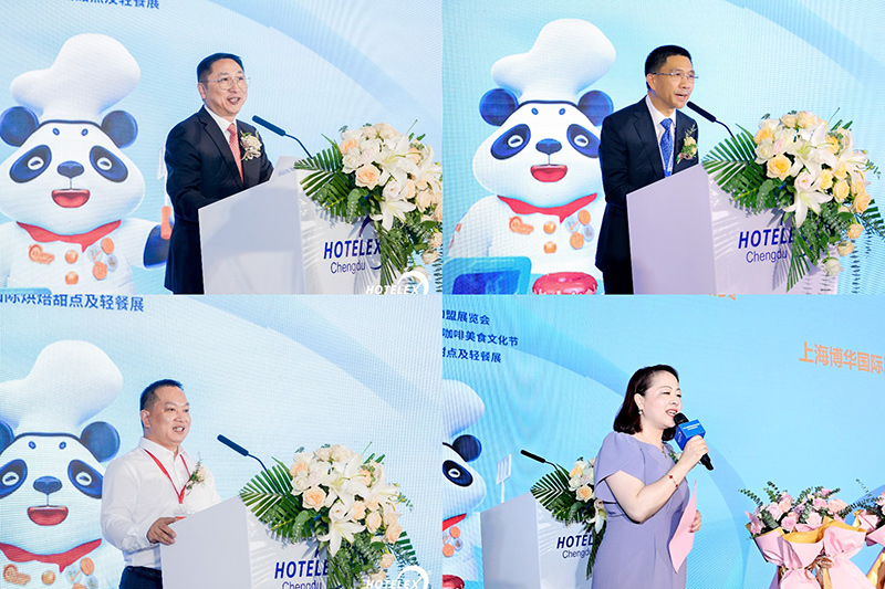 四川省旅游饭店业协会书记、常务副会长鲍小伟、成都餐饮企业联合会会长柏林、四川省清洁服务行业协会会长刘英勇和上海博华国际展览有限公司常务副总经理范海燕在开幕式上致辞