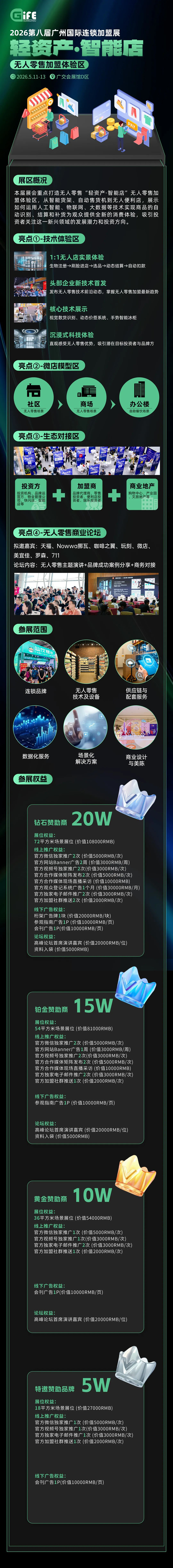 为了满足加盟者与品牌对无人零售加盟板块的强烈需求,2026年5月11-13日,广州国际连锁加盟展以”轻资产·智能店”为主题,整合往届无人智能商业资源,打造实景“无人零售加盟体验区”,包含“技术体验区+微店模型区+生态对接区+无人零售商业论坛”四大展区,实现无人商业上下游的深度链接。